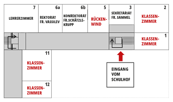 Alle Verwaltungsräume wie bspw. das Sekretariat, das Rektorat und das Lehrerzimmer befinden sich im 2. Obergeschoss.